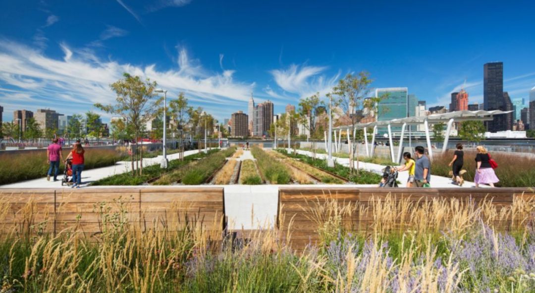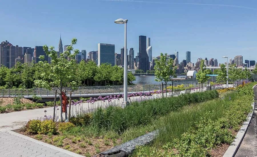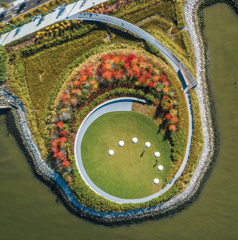 而隨著經(jīng)濟的發(fā)展,可持續(xù)開發(fā)成為獵人角南濱再次崛起的重要契機。這塊基地位于紐約市皇后區(qū)的東河(the East River)沿岸,三面環(huán)水,既是城市的濱水區(qū)和門戶區(qū),也是動植物的棲息之所,更是一處自然景致迷人的待開發(fā)區(qū)域。于是,獵人角南濱公園被列為長島市東江總體規(guī)劃中,基于這些場地歷史背景,全新的濱水區(qū)設(shè)計結(jié)合了許多綠色環(huán)保元素及舉措,將這處早已廢棄卻坐擁重要地理位置的濱水區(qū)改造成新型城市生態(tài)示范區(qū)。