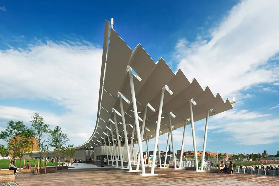 橢圓形草坪:多功能橢圓綠地構(gòu)成了公園中最為開闊的中心區(qū)域,這里不僅可以舉辦各種活動,同時也可以在草坪上欣賞曼哈頓的天際線。這一橢圓綠地形成公園的南北分界,南北沿邊各有一條曲度成弧狀的道路設(shè)施,北邊是一條綿長的林蔭步道,而南邊是帶有褶皺式鋼筋頂棚的遮蔭廊道。廊道包括兩個部分,一部分作為公園的運營和維護點,另一部分則作為休閑場所,為游人提供必要的休閑地點。該設(shè)計面向未來,運用新的技術(shù)手段,可收集雨水和太陽能,收集的雨水可以滋養(yǎng)周圍的生物,而太能能為整個公園提供50%以上的供電。同時頂棚可以容納更多的面板,將在未來為公園提供100%的供電。