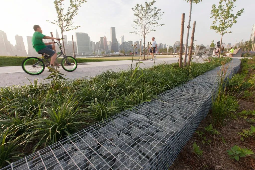 生態(tài)調(diào)節(jié)溝和石籠:生態(tài)調(diào)節(jié)溝位于公園邊緣,將中心大道和智能街道的雨水過濾,而石籠則是在漲潮時,過濾掉海水帶來的垃圾。