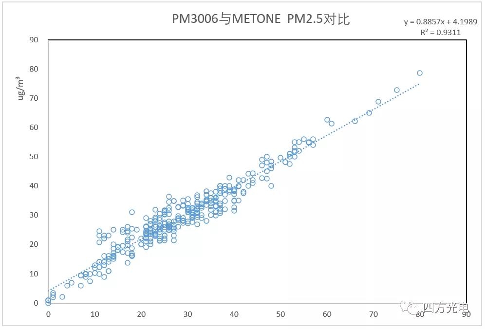 我國(guó)室外揚(yáng)塵網(wǎng)格化監(jiān)測(cè)經(jīng)歷了早期的β射線吸收法,到采用民用凈化器大量應(yīng)用的激光粉塵傳感器的過(guò)程。在使用過(guò)程中發(fā)現(xiàn),民用的激光粉塵傳感器不僅不能滿足-30——70℃室外環(huán)境溫度的全天候使用要求,同時(shí)還必須面對(duì)監(jiān)測(cè)場(chǎng)所,特別是建設(shè)工地經(jīng)常噴灑降霾的水霧影響,或者下雨潮濕的氣候環(huán)境等。這種環(huán)境下,水霧經(jīng)常被判斷為嚴(yán)重霧霾造成爆表。同時(shí)網(wǎng)格化室外粉塵監(jiān)控希望得到局部的可以與國(guó)家大氣環(huán)境監(jiān)測(cè)網(wǎng)數(shù)據(jù)具備的PM2.5/PM10/TSP的多項(xiàng)參數(shù)對(duì)比, 民用激光傳感器由于激光功率小,采樣流量小, PM10分辨率很低,無(wú)法提供準(zhǔn)確的PM10, 通常采用根據(jù)PM2.5的數(shù)字進(jìn)行比例計(jì)算,造成PM10監(jiān)測(cè)數(shù)據(jù)失真。四方光電研制的PM3003X、 PM3006激光揚(yáng)塵傳感器通過(guò)采用寬溫型大功率線型激光光源、API粉塵自動(dòng)識(shí)別技術(shù)、先進(jìn)的流道設(shè)計(jì)實(shí)現(xiàn)抗污染、大流量車規(guī)級(jí)采樣機(jī)構(gòu)、高濕度環(huán)境的水霧去除裝置等,低成本地實(shí)現(xiàn)了對(duì)室外揚(yáng)塵粉塵與β射線吸收法達(dá)到0.9相關(guān)系數(shù)的高精度測(cè)量。
