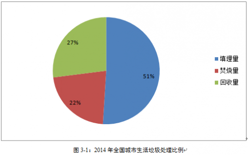 目前我國(guó)城市生活垃圾處理模式較為落后,形成了以填埋為主,焚燒為輔的終端處置格局。以2014年為例,當(dāng)年全國(guó)城市生活垃圾產(chǎn)生總量24090.94萬(wàn)噸,其中填埋量12286.4萬(wàn)噸,占比51%;焚燒量5300萬(wàn)噸,占比22%;回收量6504.54萬(wàn)噸,占比27%(見圖3-1)。