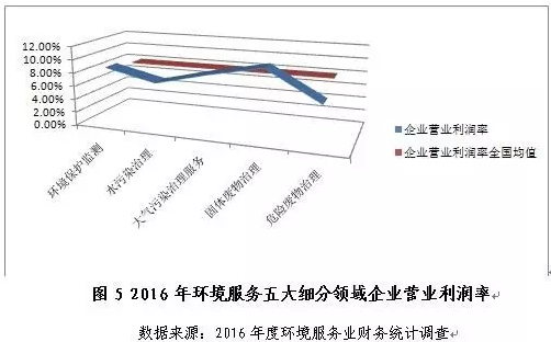 從盈利情況看,環(huán)境保護監(jiān)測、水污染治理、大氣污染治理、固體廢物治理和危險廢物治理五大細分領(lǐng)域中,僅固體廢物治理和危險廢物治理領(lǐng)域的2016年營業(yè)利潤率較2015年有所提高,固體廢物治理領(lǐng)域以10.4%的營業(yè)利潤率成為五領(lǐng)域中盈利能力最高的細分行業(yè),危險廢物治理領(lǐng)域營業(yè)利潤率同比增幅最高,約94.2%;環(huán)境保護監(jiān)測、大氣污染治理和水污染治理三領(lǐng)域的2016年營業(yè)利潤率同比分別下滑18.9%、11.3%和9.0%。
