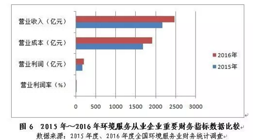 環(huán)境服務(wù)從業(yè)企業(yè)(以執(zhí)行的會計制度劃分)營業(yè)收入以高于行業(yè)整體年均漲幅0.4個百分點的增速實現(xiàn)收入的持續(xù)拉升,占年收入總額的比重由2015年的92.4%小幅升至2016年的92.7%,2016年達2469.5億元,同比增長14.2%,實現(xiàn)營業(yè)利潤額194.2億元,同比上漲20.6%。由于勞動力成本、原材料價格、融資成本漲幅總體溫和,2016年企業(yè)營業(yè)成本同比增幅約13.6%,略低于營業(yè)收入同比增速,行業(yè)營業(yè)利潤率從2015年的7.4%小幅升至2016年的7.9%。