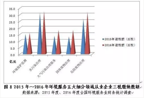 2016年企業(yè)繳納的營業(yè)稅金及附加、管理費用中的稅金、應(yīng)交增值稅之和同比增長18.5%,達125.7億元。五大細分領(lǐng)域中,水污染治理、危險廢物治理企業(yè)分別以32.5億元、31.9億元位居五大細分領(lǐng)域三稅繳納額的前兩位,分別貢獻了三稅總額的25.8%和25.4%。固體廢物治理企業(yè)2016年繳納三稅總額同比增速最大,達37.0%,這可能歸因于2016年我國城鎮(zhèn)化的深入推進,帶動了固體廢物處理領(lǐng)域市場空間的不斷擴大,以及該領(lǐng)域明顯提高的營業(yè)利潤率。