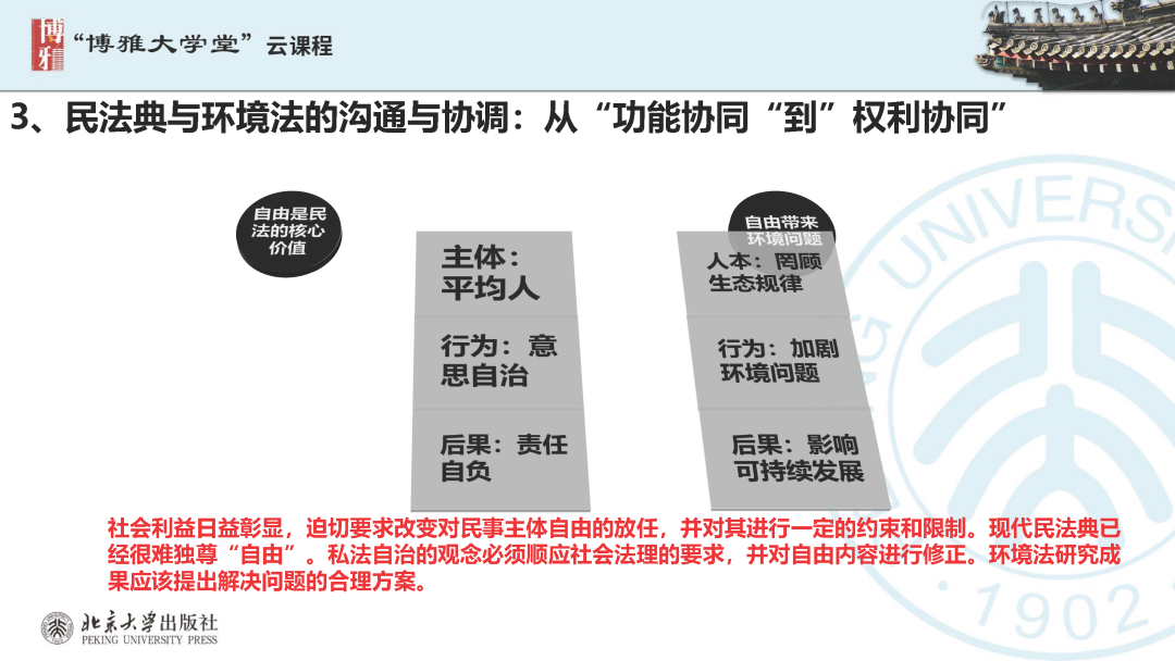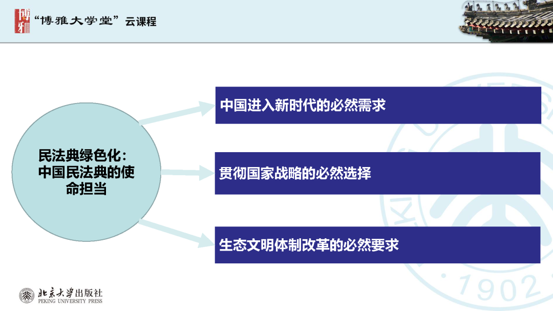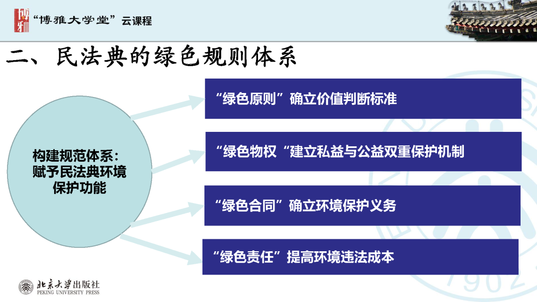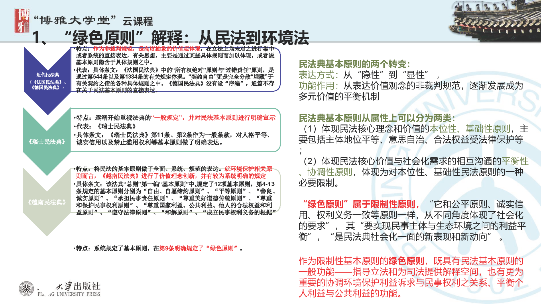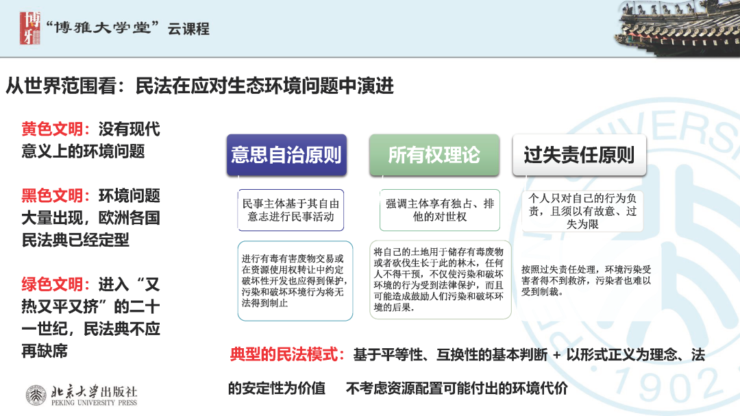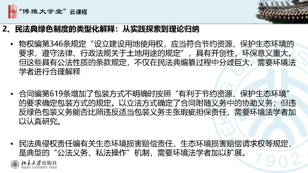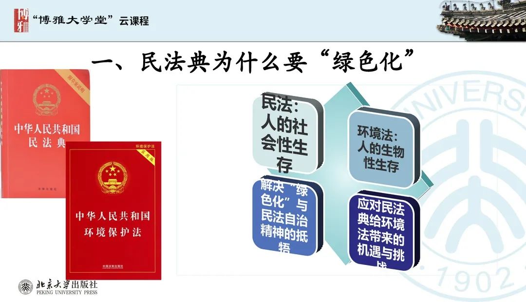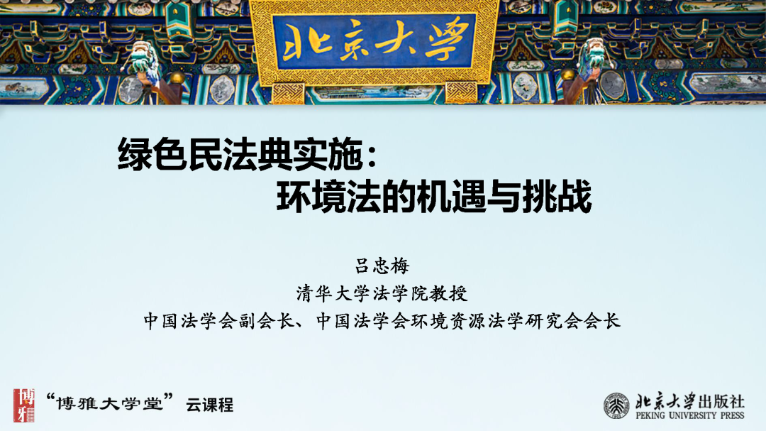 本文為?呂忠梅?老師在博雅大學(xué)堂上的報告。題目為《綠色民法典實施:環(huán)境法的機(jī)遇與挑戰(zhàn)》。內(nèi)容主要涉及民法典為什么要綠色化、民法典的綠色規(guī)則體系及綠色民法典給環(huán)境法帶來的新機(jī)遇和新挑戰(zhàn)。