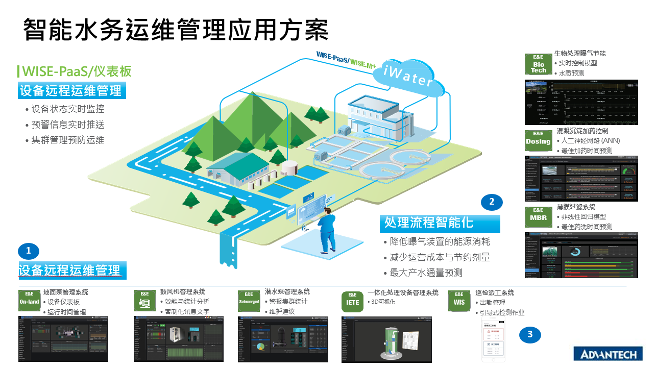 通過研華科技一站式水處理運(yùn)維管理平臺,提供數(shù)據(jù)采集,數(shù)據(jù)分析,信息可視化及預(yù)警信息推送;同時通過虛擬化對象配置、管理及模組化儀表板、2D/3D流程交互可視化展示,快速進(jìn)行系統(tǒng)整合,實現(xiàn)精準(zhǔn)管理、預(yù)防運(yùn)維,讓水資源使用、監(jiān)控與管理者得以發(fā)揮最大效益與效能。