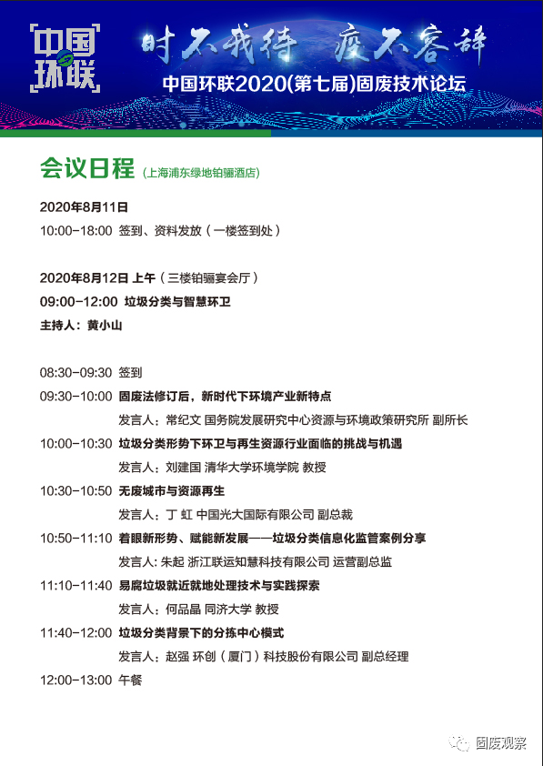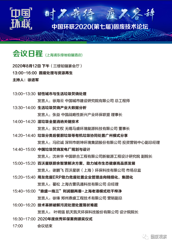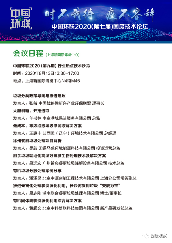 中國環(huán)聯(lián)2020(第七屆)固廢技術論壇定于2020年8月12-13日在上海市與第二十一屆中國環(huán)博會(2020年8月13-15日)背靠背召開。論壇將聚焦“疫情影響下垃圾焚燒處理潛在市場”、“垃圾分類新政策下行業(yè)特點”、“餐廚垃圾處理市場與短板”、“建筑垃圾資源化”、“固廢法修訂帶來行業(yè)新機遇”等熱點話題。我們邀請到常紀文、徐海云、劉建國、何品晶、張益、黃小山、徐進軍等資深專家,以及在垃圾分類、環(huán)衛(wèi)管理、固廢處理、無廢城市等領域的卓越企業(yè)老總等,一起解讀最新政策與行業(yè)機遇、分析市場趨勢與技術焦點、分享創(chuàng)新模式與經(jīng)營理念,共同為“后疫情時代”的環(huán)境衛(wèi)生與生態(tài)環(huán)境建設獻計獻策。
