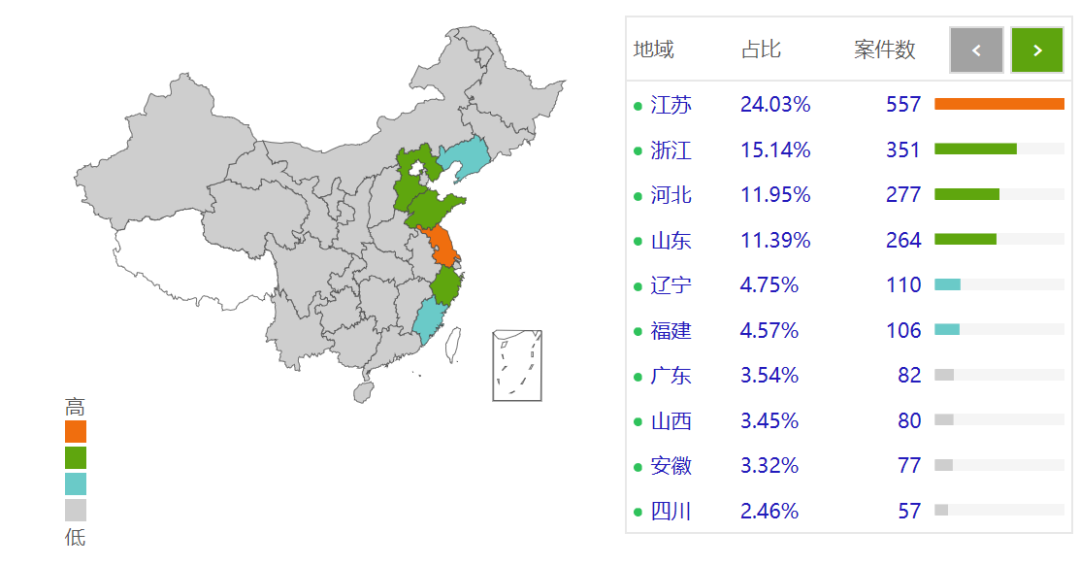 從全國來看,江蘇、浙江、河北、山東、遼寧五個省份的案件數(shù)量先后位列前五名,對此,該地區(qū)的相關從業(yè)者必須提起應有的重視!