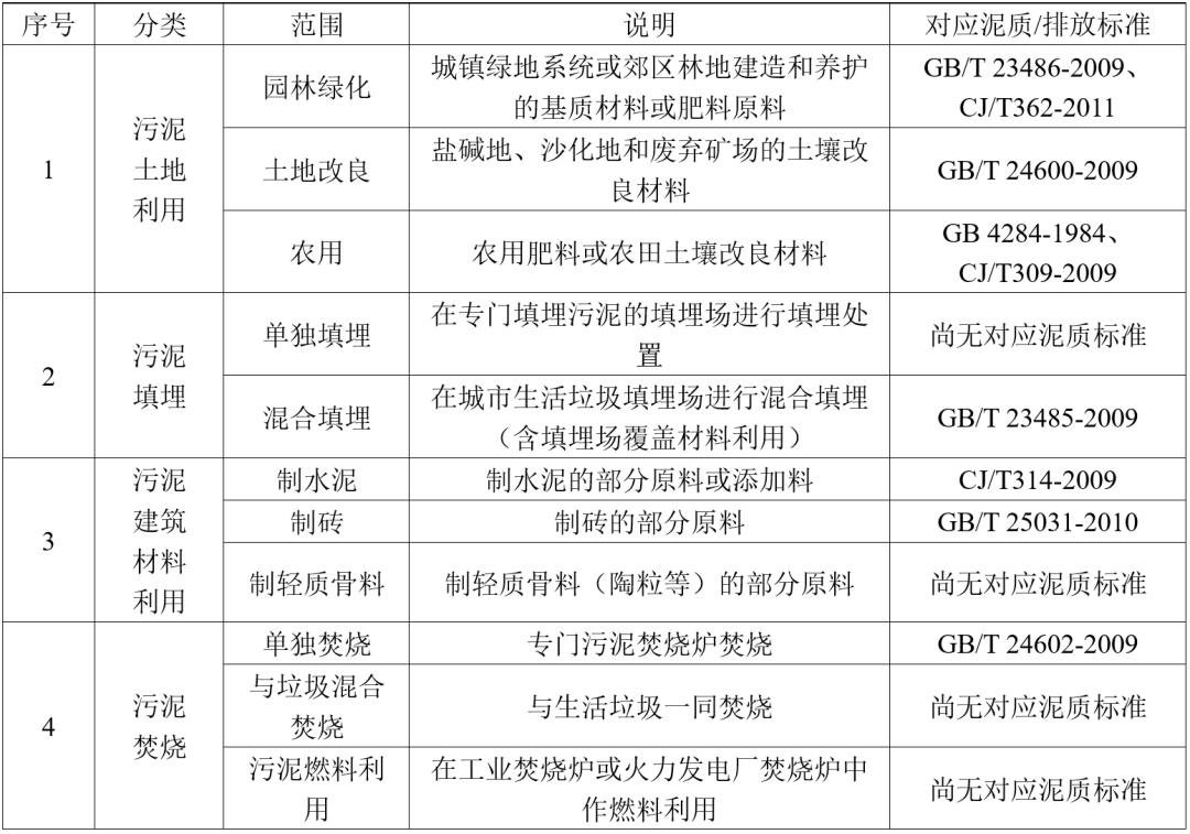 2009-2011年在住建部主導下,編制出臺了一批城鎮(zhèn)污水處理廠污泥處理處置標準,其中《GB/T23484-2009城鎮(zhèn)污水處理廠污泥處置 分類》中明確給出四類共11條處置路線,與這些處置路線對應(yīng)出臺(延用)了一系列泥質(zhì)標準。
