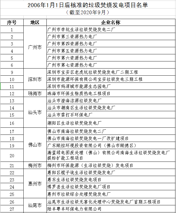 2.2006年1月1日后核準(zhǔn)的垃圾焚燒發(fā)電項(xiàng)目名單 (截至2020年9月)
