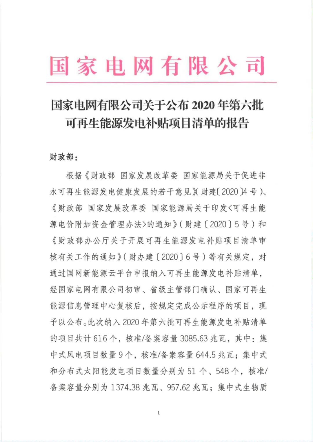 關(guān)于公布2020年第六批可再生能源發(fā)電