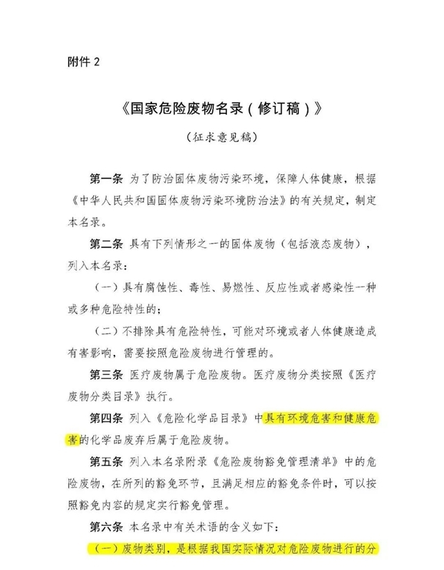 2019年9月5日,生態(tài)環(huán)境部發(fā)布關(guān)于征求《國(guó)家危險(xiǎn)廢物名錄(修訂稿)》(征求意見(jiàn)稿)意見(jiàn)的函;2019年12月30日,生態(tài)環(huán)境部發(fā)布關(guān)于公開(kāi)征求《國(guó)家危險(xiǎn)廢物名錄(修訂稿)》(二次征求意見(jiàn)稿)意見(jiàn)的通知。