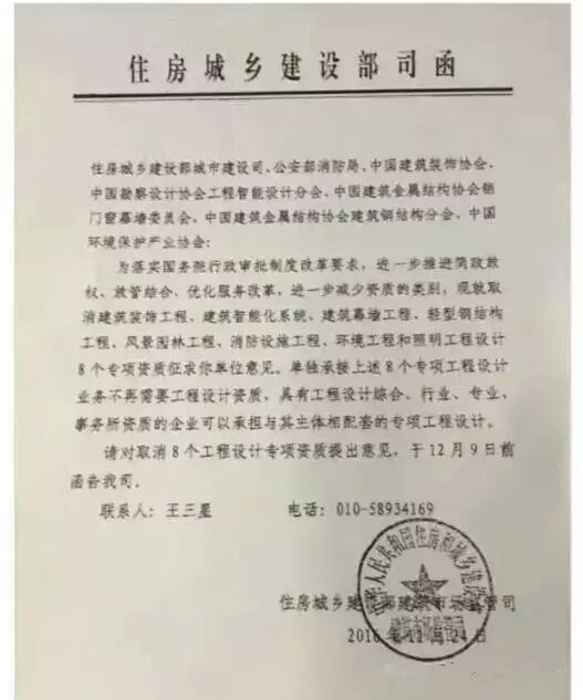 8個工程設計專項資質(zhì)包括:建筑裝飾工程,建筑智能化系統(tǒng),建筑幕墻工程,輕型鋼結(jié)構(gòu)工程,照明工程,消防設施工程,風景園林工程和環(huán)境工程,向城市建設司、公安部消防局,中國建筑裝飾協(xié)會,中國勘察設計協(xié)會工程智能設計分會,中國建筑金屬結(jié)構(gòu)協(xié)會,中國建筑環(huán)境保護產(chǎn)業(yè)協(xié)會發(fā)出此征求意見函,要求在12月9日之前給予回復。