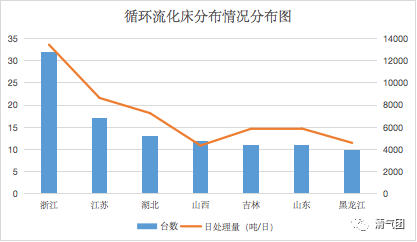 - 共有21個省份擁有一個以上的循環(huán)流化床項目,其中臺數(shù)最多,處理量最大的三個省份,分別為浙江、江蘇和湖北。