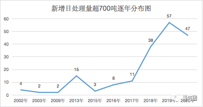 值得一提的是,800噸+循化流化床鍋爐,國內(nèi)擁有三臺,分別集中在浙能錦江武漢、淄博,以及嘉興康恒的嘉興項目。研究團隊還發(fā)現(xiàn),從2000年至今,二十多年的歷史里,循環(huán)流化床的每年投入運營臺數(shù),均未能超過20臺,最高記錄在2015年,當年有17臺循化流化床投入正式運營。大型焚燒爐和小型焚燒爐,需求旺盛,中間級焚燒爐需求持平。- 研究團隊發(fā)現(xiàn),700噸+的大型焚燒爐,在2018年之后,投入運營的臺數(shù),快速增長,2019年達到歷史投運臺數(shù)記錄,57臺。