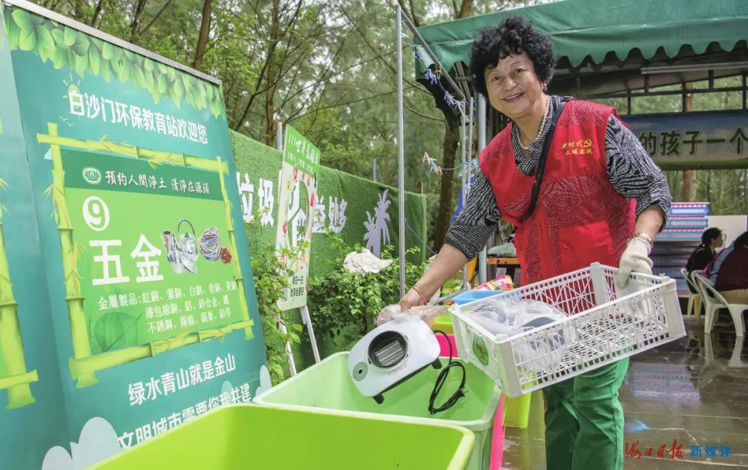 10月28日上午,在美蘭區(qū)白沙門環(huán)保教育站,一名候鳥老人志愿者正在將收集來的可回收垃圾分類投放到垃圾箱里。