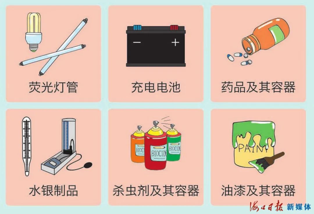 主要包括:廢電池(鎘鎳電池、氧化汞電池、鉛蓄電池等),廢熒光燈管(日光燈管、節(jié)能燈等),廢溫度計(jì),廢血壓計(jì),廢藥品及其包裝物,廢油漆、溶劑及其包裝物,廢殺蟲劑、消毒劑及其包裝物,廢膠片及廢相紙等。