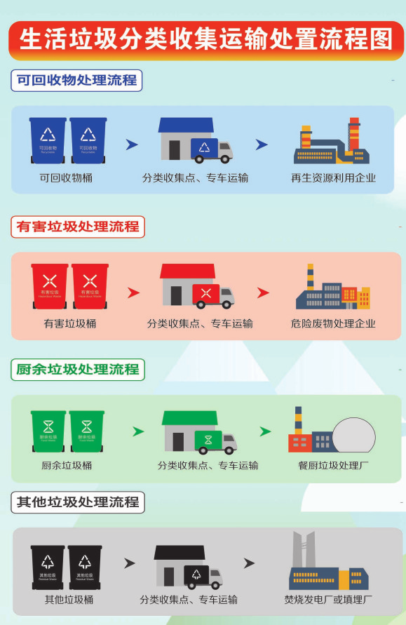 分類投放、分類收集、分類運(yùn)輸、分類處置。