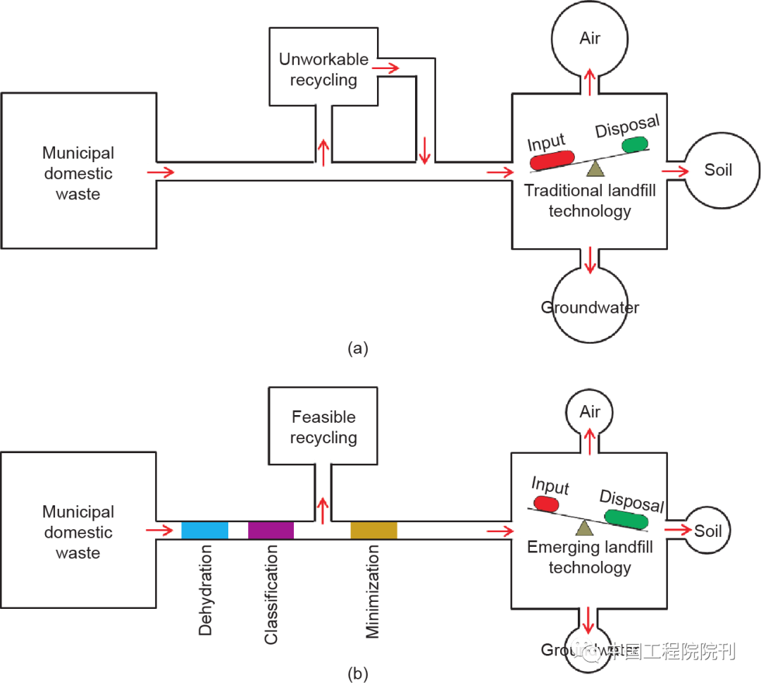 如何解決生活垃圾資源化循環(huán)不平衡、污染防治失控等關(guān)鍵問題,已成為社會、經(jīng)濟(jì)、環(huán)境保護(hù)和科技關(guān)注的焦點。近年來,我國政府高度重視改善環(huán)境問題,并加大了對生活垃圾處理的投資,這對于我國進(jìn)一步推行綠色發(fā)展模式具有重要意義。在本文中,筆者強(qiáng)調(diào)城市生活垃圾全過程處理的重要性[圖1(b)],并分別對生活垃圾處理前端的分類、減量化與資源化技術(shù),以及末端的污染物快速消化、防泄漏與修復(fù)技術(shù)提出新思路和新建議。