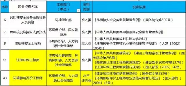 其中:涉及環(huán)境保護部實施的部門共5項,分別為:民用核安全設備無損檢驗人員資格、民用核設施操縱人員資格、注冊核安全工程師、注冊環(huán)保工程師為準入類,環(huán)境影響評價工程師為水平評價類。