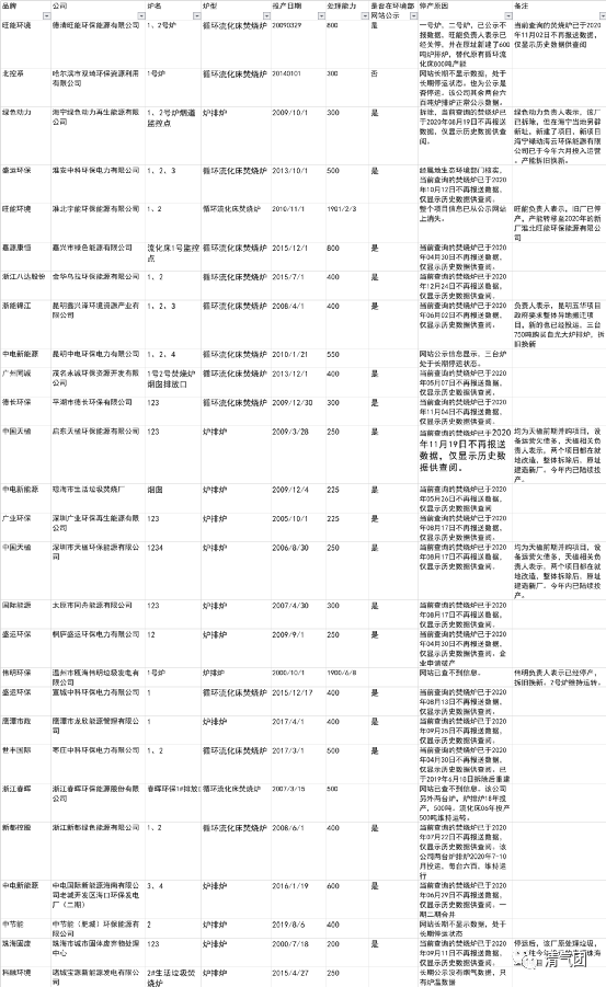 旗下的另一間企業(yè),淮北宇能環(huán)保能源有限公司(800噸處理量,兩臺(tái)循環(huán)流化床)已經(jīng)整體停運(yùn),相關(guān)垃圾處理業(yè)務(wù)也轉(zhuǎn)由該公司在此地遷址重建的新廠——淮北旺能環(huán)保能源有限公司,并已于2020年正式投運(yùn),新廠處理量1500噸,兩臺(tái)750噸爐排爐。錦江環(huán)境:旗下昆明鑫興澤環(huán)境資源產(chǎn)業(yè)有限公司,共有三臺(tái)爐,處理量為1200噸,已于2020年06月02日不再報(bào)送數(shù)據(jù),并已在生態(tài)環(huán)境部生活垃圾焚燒發(fā)電廠自動(dòng)監(jiān)測(cè)信息公示平臺(tái),進(jìn)行了主動(dòng)公示。據(jù)悉,該項(xiàng)目屬于應(yīng)政府要求整體異地搬遷、拆舊換新的項(xiàng)目,且新廠已經(jīng)投運(yùn),新項(xiàng)目的焚燒爐為三臺(tái)750噸爐排爐。不過(guò),研究團(tuán)隊(duì)尚未在公示平臺(tái)查詢到相關(guān)信息,估計(jì)還是處于試運(yùn)行狀態(tài),相關(guān)煙氣、爐溫、工況等數(shù)據(jù)尚未上網(wǎng)。中國(guó)天楹:旗下啟東和深圳項(xiàng)目,目前均整體停運(yùn),并已在生態(tài)環(huán)境部生活垃圾焚燒發(fā)電廠自動(dòng)監(jiān)測(cè)信息公示平臺(tái),進(jìn)行了主動(dòng)公示。據(jù)悉,兩個(gè)項(xiàng)目都是并購(gòu)項(xiàng)目,前期設(shè)備和環(huán)保設(shè)施欠債較多,需要進(jìn)行就地改造,整體拆除原有設(shè)備,原址新建焚燒爐臺(tái)套產(chǎn)線,基本算是原址建造新廠,且今年內(nèi)都將陸續(xù)投產(chǎn)。不過(guò),研究團(tuán)隊(duì)尚未在公示平臺(tái)查詢到相關(guān)信息,估計(jì)還是處于試運(yùn)行狀態(tài),相關(guān)煙氣、爐溫、工況等數(shù)據(jù)尚未上網(wǎng)。偉明環(huán)保:旗下溫州甌海項(xiàng)目,停運(yùn)了一臺(tái)160噸的爐排爐,該爐于2000年投產(chǎn),至今已運(yùn)行20年。綠色動(dòng)力:旗下海寧綠色動(dòng)力再生能源有限公司(處理量六百噸,兩臺(tái)09年投運(yùn)爐排爐)已經(jīng)停運(yùn)。同時(shí),在海寧當(dāng)?shù)亓肀傩轮?,新建了?xiàng)目海寧綠動(dòng)海云環(huán)保能源有限公司,已于今年六月投入運(yùn)營(yíng),新項(xiàng)目處理量為1500噸,兩臺(tái)750噸爐排爐。相關(guān)信息已在生態(tài)環(huán)境部生活垃圾焚燒發(fā)電廠自動(dòng)監(jiān)測(cè)信息公示平臺(tái),進(jìn)行了主動(dòng)公示。停運(yùn)詳細(xì)信息詳見(jiàn)下圖: