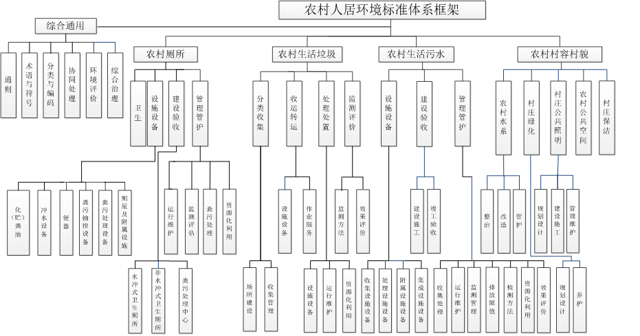 根據(jù)農(nóng)村人居環(huán)境發(fā)展現(xiàn)狀和實際需求,構(gòu)建內(nèi)容科學(xué)、結(jié)構(gòu)合理的農(nóng)村人居環(huán)境標(biāo)準(zhǔn)體系框架。體系分為三個層級,第一層級包括綜合通用、農(nóng)村廁所、農(nóng)村生活垃圾、農(nóng)村生活污水、農(nóng)村村容村貌標(biāo)準(zhǔn)子體系。第二層級由第一層級展開,包括6個綜合通用要素、4個農(nóng)村廁所要素、4個農(nóng)村生活垃圾要素、3個農(nóng)村生活污水要素、5個農(nóng)村村容村貌要素。第三層級由第二層級展開,對相應(yīng)標(biāo)準(zhǔn)要素作出進一步細化分類(如圖所示)。