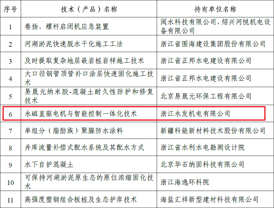 為進(jìn)一步推動浙江省水利工程建設(shè)領(lǐng)域技術(shù)創(chuàng)新和成果轉(zhuǎn)化,提升水利工程建設(shè)的科技水平,經(jīng)征集、評審和公示等程序,結(jié)合近三批《浙江省水利新技術(shù)推廣指導(dǎo)目錄》,由浙江永發(fā)機(jī)電有限公司自主研發(fā)的“永磁直驅(qū)電機(jī)與智能控制一體化技術(shù)”等共28項技術(shù)(產(chǎn)品)列入2020年度浙江省水利工程建設(shè)領(lǐng)域新技術(shù)推廣應(yīng)用清單。