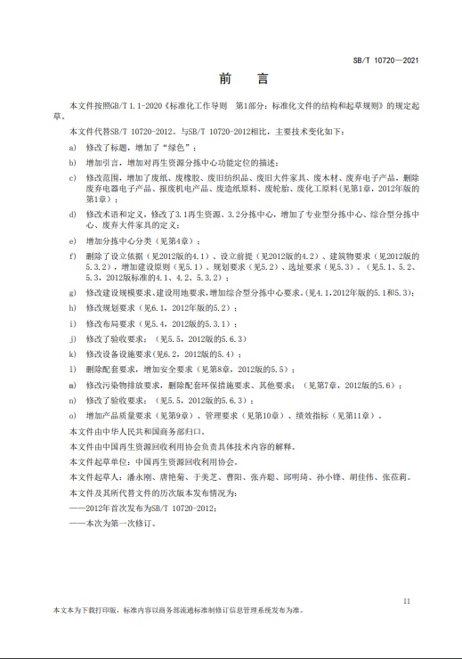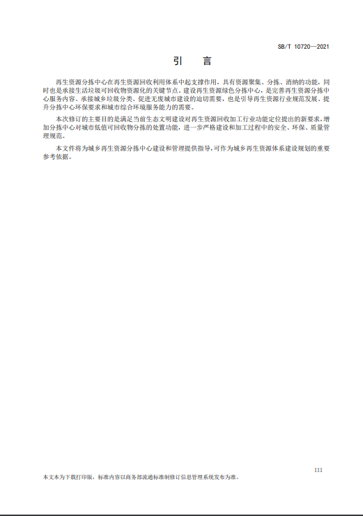 新修訂的《再生資源分揀中心建設(shè)管理規(guī)范》經(jīng)商務(wù)部公告,將于2021年5月1日實(shí)施。修訂后的標(biāo)準(zhǔn)適用范圍更為明確,增加了引言、廢棄大件家具的術(shù)語、分揀中心的分類、基本要求、部分環(huán)保要求、部分安全要求、產(chǎn)品質(zhì)量要求、管理要求和績(jī)效指標(biāo)等內(nèi)容。