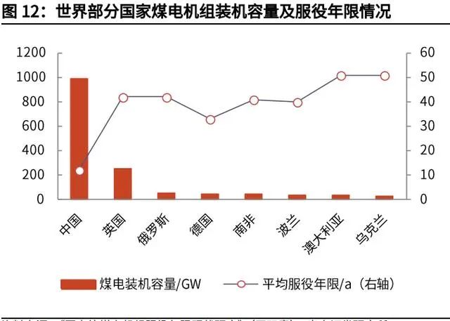 煤電資產(chǎn)擱淺的問題,表明了轉(zhuǎn)型需經(jīng)歷陣痛。一方面,從能源結(jié)構(gòu)和自身稟賦 來看,我國的能源消耗以煤為主,煤電發(fā)電量在 2019 年占總發(fā)電量的 65%,遠(yuǎn) 超發(fā)達國家;另一方面,我國煤電機組的平均服役年限僅 12 年,而發(fā)達國家普 遍達到 40 年以上。更快的碳排放量下降斜率,意味著將會有大量的未達到退役 年限的煤電資產(chǎn)提前“擱淺”。
