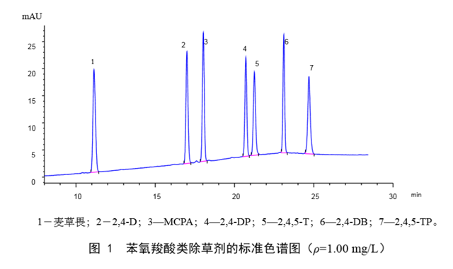 在本標(biāo)準(zhǔn)規(guī)定的儀器參考條件(8.1)下,苯氧羧酸類除草劑的標(biāo)準(zhǔn)色譜圖見(jiàn)圖 1。