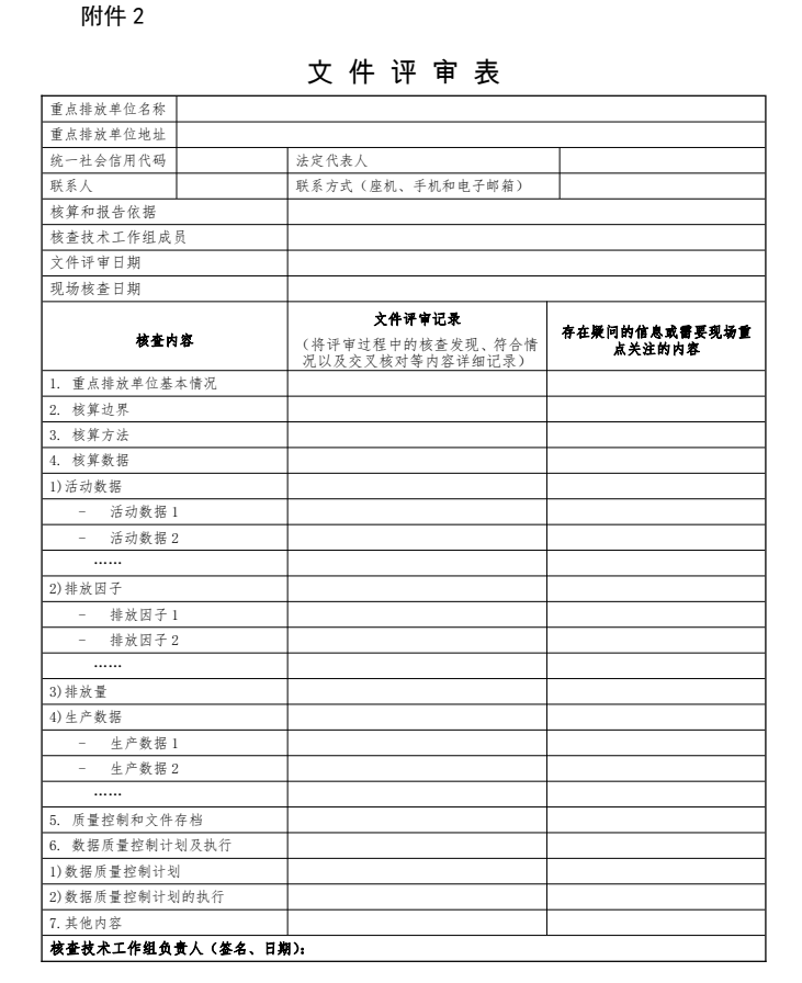 技術(shù)工作組應(yīng)根據(jù)相應(yīng)行業(yè)的溫室氣體排放核算方法與報(bào)告指南(以下簡稱核算指南)、相關(guān)技術(shù)規(guī)范,對重點(diǎn)排放單位提交的排放報(bào)告及數(shù)據(jù)質(zhì)量控制計(jì)劃等支撐材料進(jìn)行文件評審,初步確認(rèn)重點(diǎn)排放單位的溫室氣體排放量和相關(guān)信息的符合情況,識別現(xiàn)場核查重點(diǎn),提出現(xiàn)場核查時(shí)間、需訪問的人員、需觀察的設(shè)施、設(shè)備或操作以及需查閱的支撐文件等現(xiàn)場核查要求,并按附件2和附件3的格式分別填寫完成《文件評審表》和《現(xiàn)場核查清單》提交省級生態(tài)環(huán)境主管部門。
