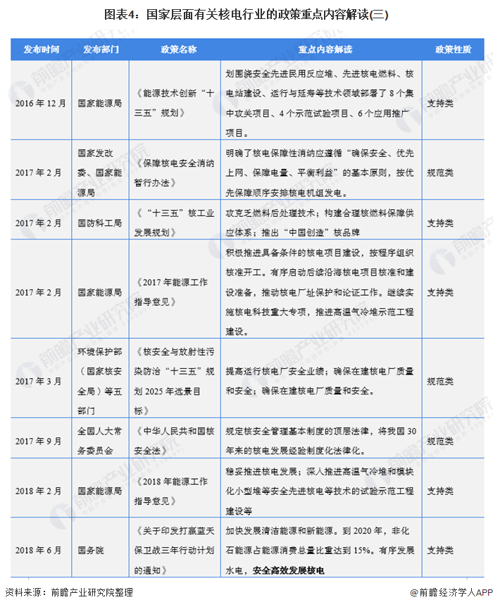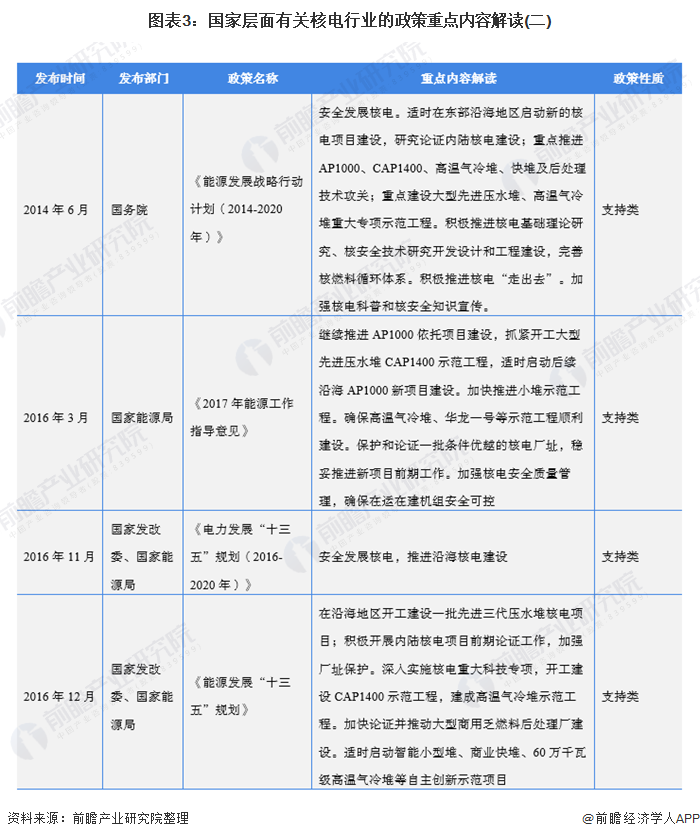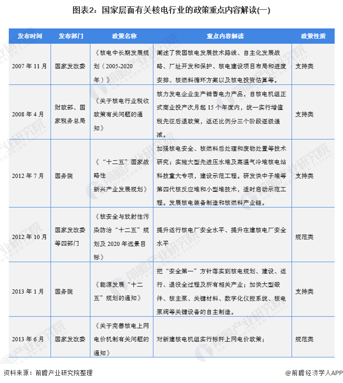 自2007年以來,國務(wù)院、國家發(fā)改委、國家能源局等多部門都陸續(xù)印發(fā)了支持、規(guī)范核電行業(yè)的發(fā)展政策,內(nèi)容涉及核電發(fā)展技術(shù)路線、核電廠建設(shè)規(guī)范、核電廠安全運行規(guī)范、上網(wǎng)電價政策等內(nèi)容: