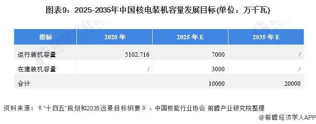 此外,根據(jù)中國核能行業(yè)協(xié)會發(fā)布的《中國核能年度發(fā)展與展望(2020)》中的預(yù)測數(shù)據(jù)顯示,到2025年,我國在運核電裝機達到7000萬千瓦,在建3000萬千瓦;到2035年,在運和在建核電裝機容量合計將達到2億千瓦;核電建設(shè)有望按照每年6至8臺機組穩(wěn)步推進。