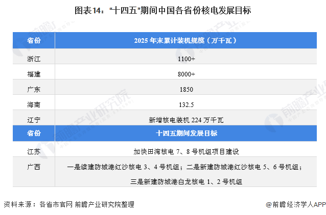 “十四五”期間,我國主要省份也提出了核電行業(yè)的發(fā)展目標。其中,浙江、福建、廣東和海南均提出了至2025年末的核電裝機規(guī)模,遼寧提出在“十四五”期間將新增核電裝機224萬千瓦。此外,江蘇、廣西雖未公布裝機規(guī)模目標,但也提出了核電項目的建設(shè)目標或規(guī)劃:
