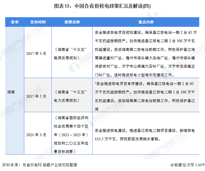 現(xiàn)有或規(guī)劃在建的核電站省份包括:江蘇、浙江、福建、山東、遼寧、廣西、廣東和海南,各省份均在“十三五”、“十四五”時期發(fā)布了推動核電建設(shè)的支持性政策,政策內(nèi)容均落實了“安全高效發(fā)展核電產(chǎn)業(yè)”的主旨: