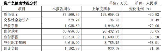 資產(chǎn)負債表顯示,應(yīng)收票據(jù)下降偏多,相較上年末下降79.00%,原因主要是承兌匯票到期兌付;交易性金融資金增長較高,相較上年末增長94.49%,原因是子公司期貨投資盈利;預(yù)計負債也較上年末增長71.16%,公司主要用于預(yù)提的大修費等。同時,貨幣資金變動相較上年末下降30.92%,主要是用銀行存款償還部分綠色公司債券;預(yù)付款項變動相較上年末增長35.65%,主要是預(yù)付材料及設(shè)備款增加。