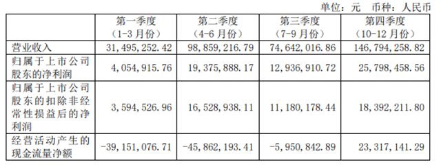 綜合分季度主要財(cái)務(wù)數(shù)據(jù)(圖2)來看,第一季度較為穩(wěn)定,收入是3149.5萬元;第二季度收入逐漸樂觀,達(dá)到了9885.9萬元;第三季度有些許下降,收入為7464.2萬元;第四季度收入明顯增長(zhǎng),達(dá)到了1.47億元,且凈利潤(rùn)和現(xiàn)金流動(dòng)凈額都有大幅的增長(zhǎng)。