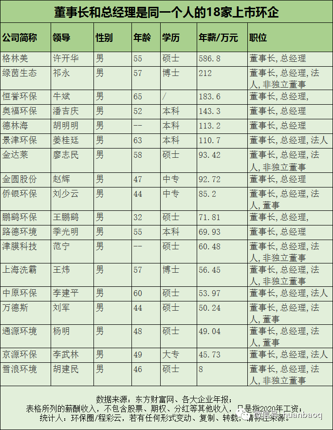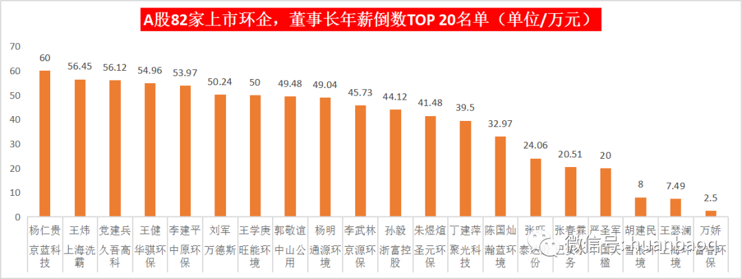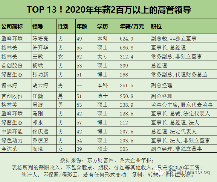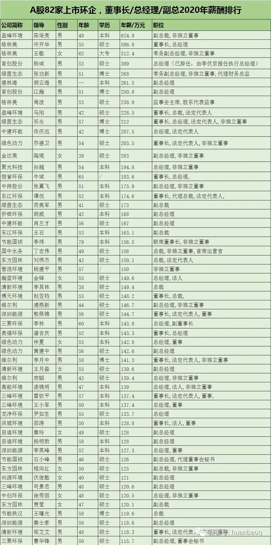 首先來看看整體情況,應該說,環(huán)保企業(yè)高管的薪酬水平差距還是挺大的。總體來看,217位上市環(huán)企高管,去年年薪累計高達2.1億元,平均每人97萬元/年,每月近9萬元。也就是說,從平均水平上看,環(huán)保企業(yè)高管的年薪已經(jīng)達到“百萬級”了。但事實上,每個人的情況差別非常大。最高的,可以拿到625萬元;最低的,則只有2.4萬元,足足相差了260倍,簡直是天壤之別。為了便于觀察,我們把高管年薪分為“100萬元以上”、“50萬-100萬元之間”,以及“50萬元以下”三個檔。217位高管中,年薪收入在百萬元以上的有71位,約占33%;年薪在50萬元-100萬元之間的有112位,約占52%;還有15%的企業(yè)高管,去年年薪收入在50萬元以下,約占15%左右(如圖一所示)。圖一:217位上市環(huán)企高管薪酬收入分布也就是說,217位高管中,有1/3收入較高,在100萬元以上;有一半收入居中,在50萬-100萬元之間;還有15%收入“偏低”,在50萬元以下。如果再拔高一個級別,看一看收入兩百萬元以上的,就只剩下為數(shù)不多的13個人了,分別供職于盈峰環(huán)境、格林美、首創(chuàng)股份、綠茵生態(tài)、中建環(huán)能、綠色動力等8家上市環(huán)企(如圖二所示)。圖二:年薪過200萬的13位上市環(huán)企高管其中,年薪最高的當屬盈峰環(huán)境副總裁陳培亮,去年年薪高達625萬元,比總裁馬剛還要高出396萬元,可謂是環(huán)保領(lǐng)域的“最強打工人”。很多人或許對陳培亮還不夠了解,其實他在成為盈峰環(huán)境副總裁之前,就已經(jīng)有非常光鮮的履歷。早在10年前的2010年,38歲的他就已經(jīng)成為中聯(lián)重科的副總裁,在他的帶領(lǐng)下,中聯(lián)重科大力研發(fā)環(huán)衛(wèi)裝備制造,逐步成為環(huán)保行業(yè)的龍頭企業(yè)。正是由于其在環(huán)衛(wèi)裝備制造的杰出表現(xiàn),5年前,盈峰環(huán)境斥巨資從中聯(lián)重科購買中聯(lián)環(huán)境(現(xiàn)盈峰中聯(lián))全部股份,而作為中聯(lián)環(huán)境曾經(jīng)的總經(jīng)理陳培亮,自然也被委以重用,給予了非常高的薪酬。從盈峰中聯(lián)的表現(xiàn)來看,應該說,這份年薪是他應得的。排名第二的是格林美的兩位高管——55歲的董事長許開華(587萬元/年)和62歲的常務(wù)副總王敏(312萬元/年)。值得一提的是,相比2019年(年薪805萬元),許開華在2020年的年薪已經(jīng)“自降”了218萬元,這或許與公司去年的凈利潤下滑有關(guān)。217位上市環(huán)企高管中,有58位,占比約1/4的高管年薪在100萬元-200萬元之間。其中,年薪150萬元以上的有:中持股份副總經(jīng)理張翼飛、東江環(huán)保董事長譚侃、節(jié)能國禎創(chuàng)始人李煒、東方園林董事長劉偉杰、博天環(huán)境董事長趙笠鈞、瀚藍環(huán)境總經(jīng)理金鐸、清新環(huán)境總裁李其林、維爾利董事長李月中等。年薪在100萬元-150萬元之間的,多數(shù)都是成長較快、發(fā)展極具潛力的新上市環(huán)企,比如去年六五環(huán)境日剛上市的三峰環(huán)境,其董事長雷欽平、總經(jīng)理王小軍、副總經(jīng)理司景忠年薪都是在120萬元-140萬元之間。再如去年5月8日在科創(chuàng)板上市的金科環(huán)境,其董事長張慧春、總經(jīng)理劉正洪和副總經(jīng)理崔紅梅年薪也都在100萬元左右,其中張慧春和劉正洪薪資收入相同,去年年薪均為107萬元。總的來說,以上就是環(huán)保行業(yè)收入最高的群體了。從年薪上看,收入相對更高的還是民企,比如盈峰環(huán)境、格林美、維爾利,以及“混改”之前的中持股份、國禎環(huán)保、博天環(huán)境、清新環(huán)境等等。這些企業(yè),基本也代表著環(huán)保行業(yè)的最高水準,企業(yè)效益更好,所以高管薪酬更高也就不足為怪了。在“A股上市環(huán)企董事長年薪TOP20榜單”中,格林美的許開華以587萬元高居榜首,比第二名(盈峰環(huán)境董事長馬剛)和第三名(綠茵生態(tài)祁永)的總和還要高出150萬元。(如圖三所示)。圖三:A股82家上市環(huán)企,董事長年薪排名前TOP20也有的老板不舍得為自己開工資,在圖四“董事長年薪倒數(shù)TOP20榜單”中,2020年年薪最低的董事長只有2.5萬元,月平均工資約2000元,這水平都抵不上一位普通的職員。圖四:A股82家上市環(huán)企,董事長年薪倒數(shù)TOP20這位拿著2.5萬元年薪的董事長,就是富春環(huán)保董事長萬嬌。公開資料顯示,富春環(huán)保董事長萬嬌是一位1988年出生,年僅33歲的女掌門人,但其掌門的富春環(huán)保,市值則已高達56億元。眾所周知,富春環(huán)保是一家剛剛經(jīng)歷了“混改”的企業(yè),去年南昌市國資委剛剛?cè)胫鳎f嬌則是由南昌國資提名,代替原董事長的人選。事實上,在統(tǒng)計董事長薪資收入時,我們發(fā)現(xiàn)了一個有趣的現(xiàn)象——好多上市環(huán)企,副總、總經(jīng)理的年薪都要高于董事長!甚至有的董事長(如首創(chuàng)股份劉永政),都沒有在公司領(lǐng)取任何報酬!不過,這些董事長收入較低的企業(yè),很多還都是業(yè)績表現(xiàn)不錯的企業(yè),比如瀚藍環(huán)境、中國天楹、上海環(huán)境、富春環(huán)保等。或許,董事長情愿“讓賢”,讓更專業(yè)的人才來管理企業(yè),并給予更高的報酬,也是這些企業(yè)發(fā)展更好的原因之一吧。總經(jīng)理年薪排行:首創(chuàng)股份位居第二首先,很多環(huán)保公司,董事長和總經