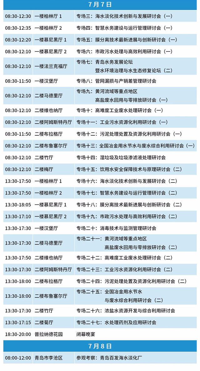 今日,還有海水淡化、智慧水務、管網(wǎng)漏損與產(chǎn)銷差管理、消毒技術與檢測管理、膜分離、市政污水處理與高效利用、水環(huán)境治理與水生態(tài)修復、黃河流域等重點地區(qū)高鹽廢水回用與零排放、高難度工業(yè)廢水、工業(yè)污水資源化利用、污泥處理處置、冶金、濕垃圾及垃圾滲濾液、飲用水安全保障技術與原理、濃鹽水、藥劑等25個專場的演講報告將按序召開!