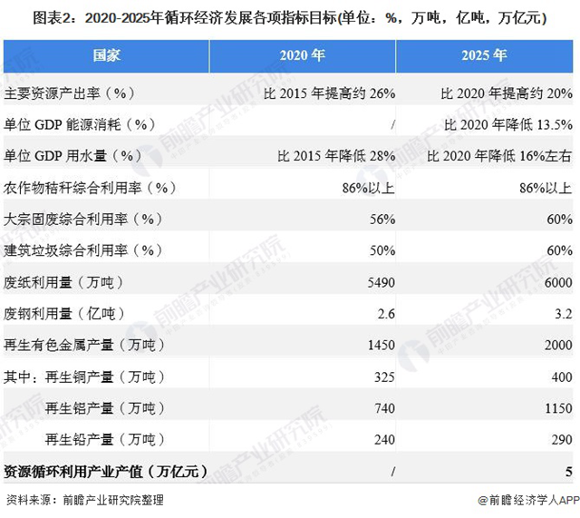 到2025年,我國(guó)循環(huán)經(jīng)濟(jì)發(fā)展各項(xiàng)指標(biāo)將有所提升,包括主要資源產(chǎn)出率比2020年提高約20%,單位GDP能源消耗、用水量比2020年分別降低 13.5%、16%左右等。2025年,我國(guó)資源循環(huán)利用產(chǎn)業(yè)產(chǎn)值將達(dá)到5萬(wàn)億元。