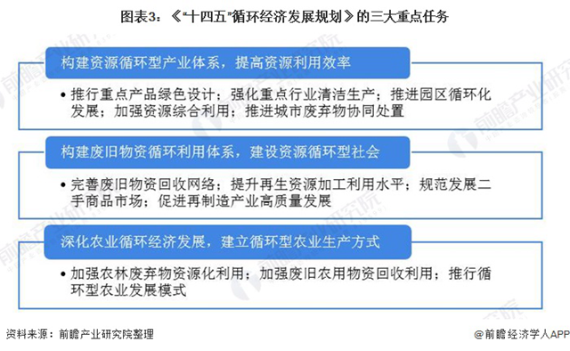 《規(guī)劃》提出了三大重點(diǎn)任務(wù)包括:構(gòu)建資源循環(huán)型產(chǎn)業(yè)體系,提高資源利用效率;構(gòu)建廢舊物資循環(huán)利用體系,建設(shè)資源循環(huán)型社會(huì);深化農(nóng)業(yè)循環(huán)經(jīng)濟(jì)發(fā)展,建立循環(huán)型農(nóng)業(yè)生產(chǎn)方式。