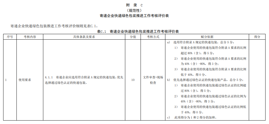 附錄C的考核評價表總分為100分,寄遞企業(yè)可依據(jù)賦分細則對每一條款進行評分。