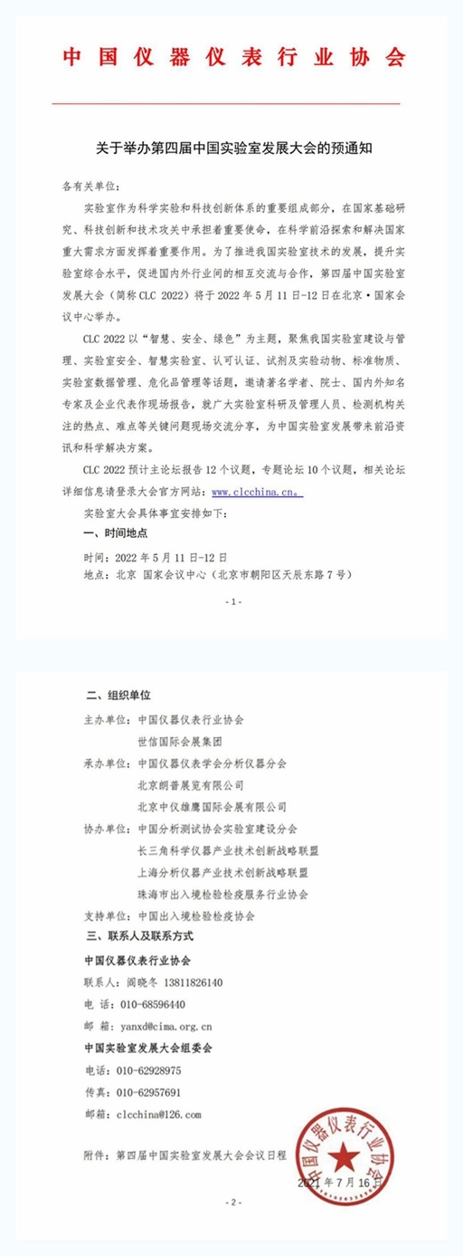 為了推進(jìn)我國實驗室技術(shù)的發(fā)展,提升實驗室綜合水平,促進(jìn)行業(yè)國內(nèi)外之間的相互交流與合作,一年一度的中國實驗室發(fā)展大會即將于2022年5月11日-12日在北京·國家會議中心再度拉開帷幕!《關(guān)于舉辦第四屆中國實驗室發(fā)展大會的預(yù)通知》正式發(fā)布,敬請各位業(yè)內(nèi)工作者閱讀知曉: