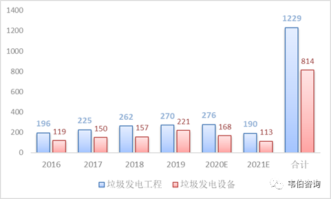 根據(jù)對(duì)光大國(guó)際、海螺創(chuàng)業(yè)、上海環(huán)境、偉明環(huán)保、綠色動(dòng)力等12家垃圾發(fā)電上市公司運(yùn)營(yíng)項(xiàng)目投資額的測(cè)算,得到2016-2019年垃圾發(fā)電項(xiàng)目單位投資成本由54萬(wàn)元/(噸/日)提高至55萬(wàn)元/(噸/日),假設(shè)2020年單位投資成本小幅提升至56萬(wàn)元/(噸/日);考慮典型的垃圾發(fā)電項(xiàng)目投資結(jié)構(gòu),工程土建、工程安裝、設(shè)備以及其他分別占比25%、13%、38%、24%,同時(shí)假設(shè)垃圾焚燒發(fā)電項(xiàng)目建設(shè)周期為18個(gè)月,T年投運(yùn)的項(xiàng)目在T-2/T-1/T年的建設(shè)期分別為2.5/10/5.5個(gè)月,則2016-2021年間垃圾發(fā)電總工程及設(shè)備市場(chǎng)規(guī)模分別達(dá)到1229億元和814億元。