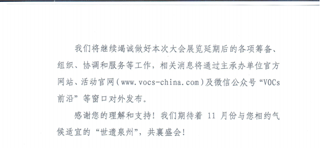 因近期國內(nèi)疫情防控形勢趨于嚴峻,環(huán)保在線記者從中華環(huán)保聯(lián)合會獲悉,為切實保障嘉賓、展商和觀眾的身體健康,經(jīng)主辦單位研究決定,原定于2021年8月21-23日在福建泉州(福建成功國際會展中心)召開的“2021全國揮發(fā)性有機物(VOCs)污染防治科技大會暨2021全國揮發(fā)性有機物(VOCs)污染防治技術(shù)裝備博覽會、2021全國惡臭污染物測試、環(huán)境監(jiān)測與控制技術(shù)裝備展覽會”以及同期系列活動將延期至2021年11月18-20日舉行,活動地點不變。相關(guān)消息將通過主承辦單位網(wǎng)站、活動及微信公眾號“VOCs前沿”、戰(zhàn)略合作媒體“環(huán)保在線”等窗口對外發(fā)布。