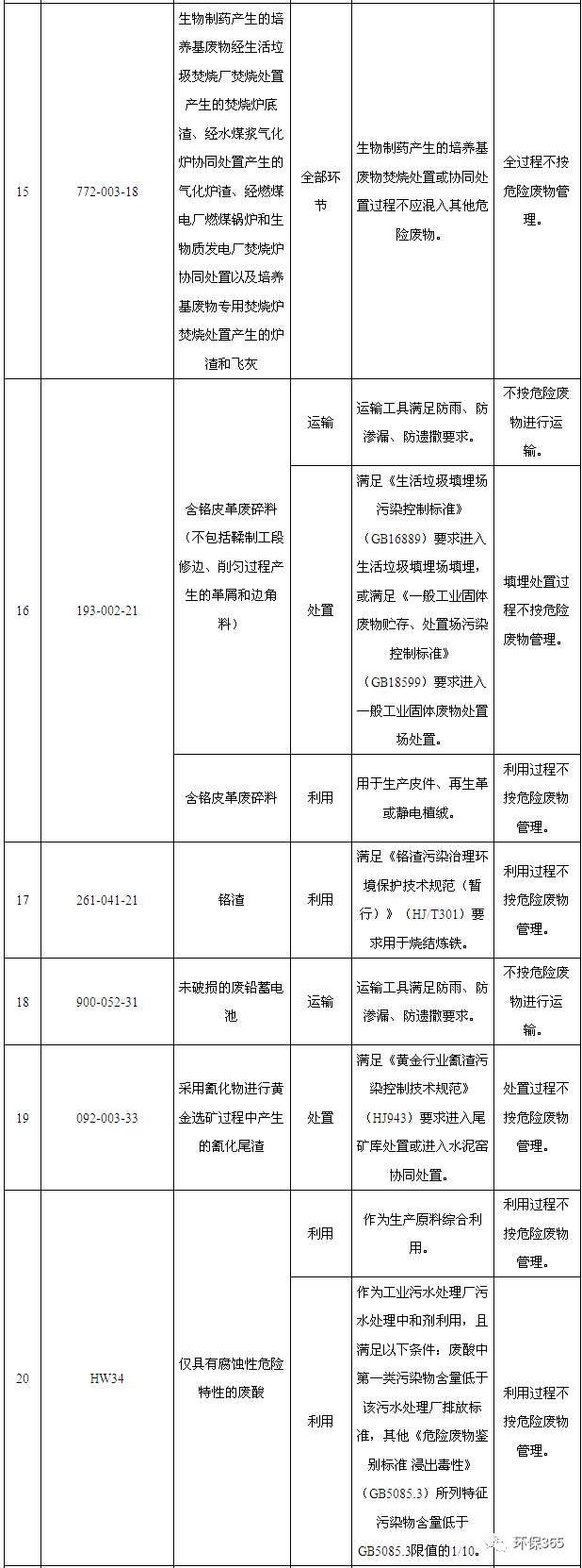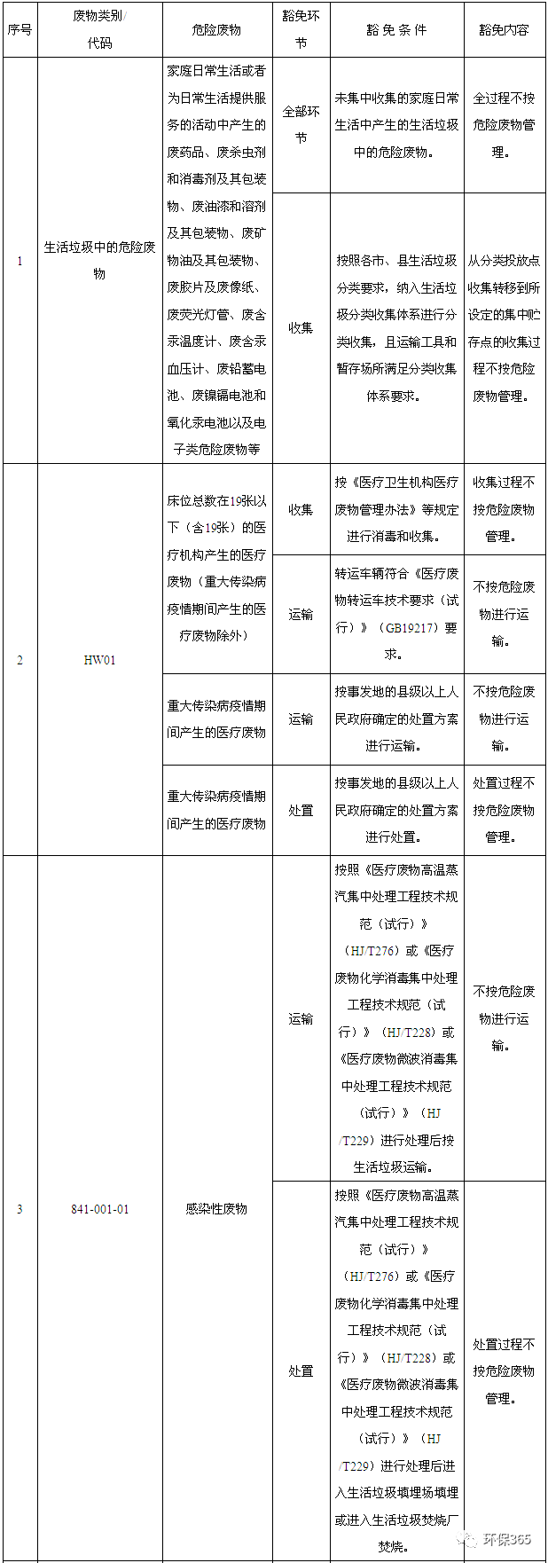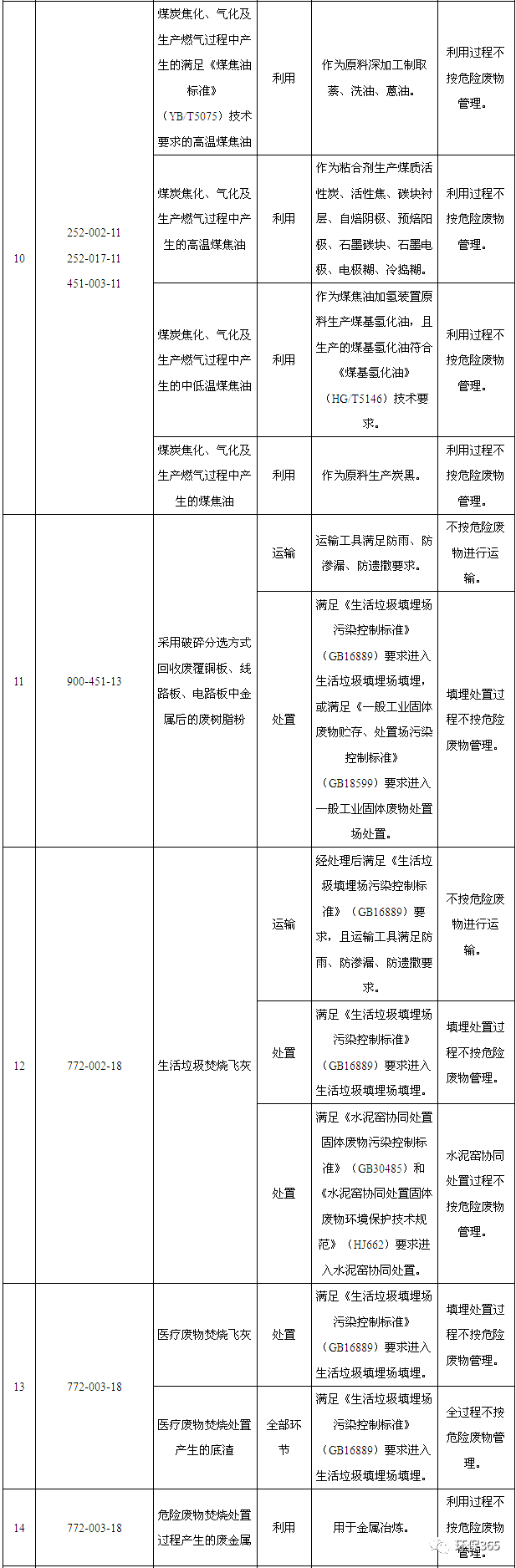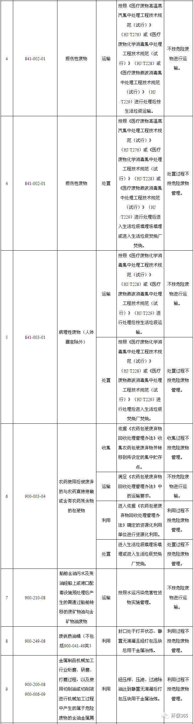 (1)家庭日常生活或者為日常生活提供服務的活動中產生的廢藥品、廢殺蟲劑和消毒劑及其包裝物、廢油漆和溶劑及其包裝物、廢礦物油及其包裝物、廢膠片及廢像紙、廢熒光燈管、廢含汞溫度計、廢含汞血壓計、廢鉛蓄電池、廢鎳鎘電池和氧化汞電池以及電子類危險廢物等未經過集中收集的全部環(huán)節(jié)不按危險廢物管理;按照各市、縣生活垃圾分類要求,納入生活垃圾分類收集體系進行分類收集,且運輸工具和暫存場所滿足分類收集體系要求的,從分類投放點收集轉移到所設定的集中貯存點的收集過程不按危險廢物管理。(2)床位總數(shù)在19張以下(含19張)的醫(yī)療機構產生的醫(yī)療廢物(重大傳染病疫情期間產生的醫(yī)療廢物除外)按《醫(yī)療衛(wèi)生機構醫(yī)療廢物管理辦法》等規(guī)定進行消毒和收集的,收集過程不按危險廢物管理;轉運車輛符合《醫(yī)療廢物轉運車技術要求(試行)》(GB19217)要求的,不按危險廢物進行運輸;重大傳染病疫情期間產生的醫(yī)療廢物,按事發(fā)地的縣級以上人民政府確定的處置方案進行運輸?shù)?,不按危險廢物進行運輸;按事發(fā)地的縣級以上人民政府確定的處置方案進行處置的,處置過程不按危險廢物管理。(3)感染性廢物按照《醫(yī)療廢物高溫蒸汽集中處理工程技術規(guī)范(試行)》(HJ/T276)或《醫(yī)療廢物化學消毒集中處理工程技術規(guī)范(試行)》(HJ/T228)或《醫(yī)療廢物微波消毒集中處理工程技術規(guī)范(試行)》(HJ/T229)進行處理后按生活垃圾運輸?shù)模话次kU廢物進行運輸;按照《醫(yī)療廢物高溫蒸汽集中處理工程技術規(guī)范(試行)》(HJ/T276)或《醫(yī)療廢物化學消毒集中處理工程技術規(guī)范(試行)》(HJ/T228)或《醫(yī)療廢物微波消毒集中處理工程技術規(guī)范(試行)》(HJ/T229)進行處理后進入生活垃圾填埋場填埋或進入生活垃圾焚燒廠焚燒的,處置過程不按危險廢物管理。(4)損傷性廢物按照《醫(yī)療廢物高溫蒸汽集中處理工程技術規(guī)范(試行)》(HJ/T276)或《醫(yī)療廢物化學消毒集中處理工程技術規(guī)范(試行)》(HJ/T228)或《醫(yī)療廢物微波消毒集中處理工程技術規(guī)范(試行)》(HJ/T229)進行處理后按生活垃圾運輸?shù)?,不按危險廢物進行運輸;按照《醫(yī)療廢物高溫蒸汽集中處理工程技術規(guī)范(試行)》(HJ/T276)或《醫(yī)療廢物化學消毒集中處理工程技術規(guī)范(試行)》(HJ/T228)或《醫(yī)療廢物微波消毒集中處理工程技術規(guī)范(試行)》(HJ/T229)進行處理后進入生活垃圾填埋場填埋或進入生活垃圾焚燒廠焚燒的,處置過程不按危險廢物管理。(5)病理性廢物(人體器官除外)按照《醫(yī)療廢物化學消毒集中處理工程技術規(guī)范(試行)》(HJ/T228)或《醫(yī)療廢物微波消毒集中處理工程技術規(guī)范(試行)》(HJ/T229)進行處理后按生活垃圾運輸?shù)?,不按危險廢物進行運輸;按照《醫(yī)療廢物化學消毒集中處理工程技術規(guī)范(試行)》(HJ/T228)或《醫(yī)療廢物微波消毒集中處理工程技術規(guī)范(試行)》(HJ/T229)進行處理后進入生活垃圾焚燒廠焚燒的,處置過程不按危險廢物管理。(6)農藥使用后被廢棄的與農藥直接接觸或含有農藥殘余物的包裝物依據《農藥包裝廢棄物回收處理管理辦法》收集并轉移到所設定的集中貯存點的,收集過程不按危險廢物管理;滿足《農藥包裝廢棄物回收處理管理辦法》中的運輸要求的,不按危險廢物進行運輸;進入依據《農藥包裝廢棄物回收處理管理辦法》確定的資源化利用單位進行資源化利用的,利用過程不按危險廢物管理;進入生活垃圾填埋場填埋或進入生活垃圾焚燒廠焚燒的,處置過程不按危險廢物管理。(7)船舶含油污水及殘油經船上或港口配套設施預處理后產生的需通過船舶轉移的廢礦物油與含礦物油廢物按照水運污染危害性貨物實施管理的,不按危險廢物進行運輸。(8)廢鐵質油桶(不包括900-041-49類)封口處于打開狀態(tài)、靜置無滴漏且經打包壓塊后用于金屬冶煉的,利用過程不按危險廢物管理。(9)金屬制品機械加工行業(yè)珩磨、研磨、打磨過程,以及使用切削油或切削液進行機械加工過程中產生的屬于危險廢物的含油金屬屑經壓榨、壓濾、過濾除油達到靜置無滴漏后打包壓塊用于金屬冶煉的,利用過程不按危險廢物管理。(10)煤炭焦化、氣化及生產燃氣過程中產生的滿足《煤焦油標準》(YB/T5075)技術要求的高溫煤焦油作為原料深加工制取萘、洗油、蒽油的,利用過程不按危險廢物管理。煤炭焦化、氣化及生產燃氣過程中產生的高溫煤焦油作為粘合劑生產煤質活性炭、活性焦、碳塊襯層、自焙陰極、預焙陽極、石墨碳塊、石墨電極、電極糊、冷搗糊的,利用過程不按危險廢物管理。煤炭焦化、氣化及生產燃氣過程中產生的中低溫煤焦油作為煤焦油加氫裝置原料生產煤基氫化油,且生產的煤基氫化油符合《煤基氫化油》(HG/T5146)技術要求的,利用過程不按危險廢物管理。煤炭焦化、氣化及生產燃氣過程中產生的煤焦油作為原料生產炭黑的,利用過程不按危險廢物管理。(11)采用破碎分選方式回收廢覆銅板、線路板、電路板中金屬后的廢樹脂粉運輸工具滿足防雨、防滲漏、防遺撒要求的,不按危險廢物進行運輸;滿足《生活垃圾填埋場污染控制標準》(GB16889)要求進入生活垃圾填埋場填埋,或滿足《一般工業(yè)固體廢物