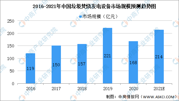 焚燒爐作為垃圾焚燒處理系統(tǒng)最核心的設(shè)備,其設(shè)計需充分考慮垃圾停留時間、燃燒溫度、煙氣在爐內(nèi)的停留時間及紊流等因素,從而達(dá)到完全燃燒、控制惡臭及二惡英類物質(zhì)產(chǎn)生的目的。目前國內(nèi)外應(yīng)用較多、技術(shù)比較成熟的生活垃圾焚燒爐主要包括流化床焚燒爐、爐排爐型焚燒爐等。2020年,垃圾焚燒發(fā)電設(shè)備市場規(guī)模約為168億元。預(yù)計2021年我國垃圾焚燒發(fā)電設(shè)備市場規(guī)模可達(dá)214億元。