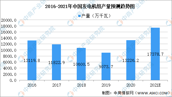 一般我們常見的發(fā)電機組通常由汽輪機、水輪機或內(nèi)燃機(汽油機、柴油機等發(fā)動機)驅(qū)動,可再生新能源包括核能、風(fēng)能、太陽能、生物質(zhì)能、海洋能等。數(shù)據(jù)顯示,我國發(fā)電機組產(chǎn)量呈波動趨勢,2020年我國發(fā)電機組產(chǎn)量達(dá)13226.2萬千瓦,預(yù)計2021年我國發(fā)電機組產(chǎn)量可達(dá)17378.7萬千瓦。