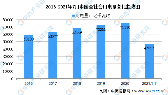 數(shù)據(jù)顯示,去年疫情影響基數(shù)低,2020年全社會用電量7.51萬億千瓦時,同比增長3.1%。2021年1-7月,全社會用電量累計47097億千瓦時,同比增長15.6%。