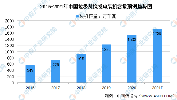 數(shù)據(jù)顯示,我國垃圾焚燒發(fā)電裝機容量由2016年549萬千瓦增至2020年1533萬千瓦,年均復(fù)合增長率為29.27%。中商產(chǎn)業(yè)研究院預(yù)測,2021年垃圾焚燒發(fā)電裝機容量可達(dá)1729萬千瓦。